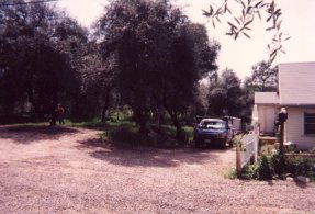 I considered many water managemant possibilities, but it became much easier when I decided I didn't need to keep the driveway. There was a large parking area next to the driveway, and thats where I tended to park anyway. So I tore up the old driveway, dammed and bermed the end of it by the road, then leveled and graveled the parking space. Here are picture taken in 2001 to show the changes. The second picture is taken from near the house, looking back up toward the road where the driveway used to be.