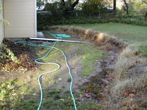 Here are a few more pictures of the results of the grading. That curve in front of the house is picked up again on the other side of the ex-driveway, leaving the old garage slab as a nicely located little patio.