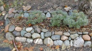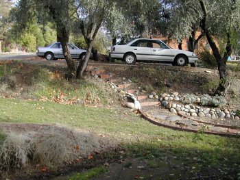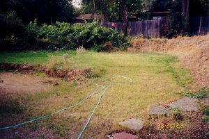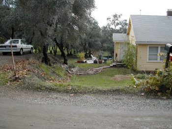 But wait, there's more. In front of the house, there used to be a cement slab patio. It was cracked, and it was only a few inches below the wood siding on the house. Furthermore, both the lawn and the slab slanted towards the house. The slab was removed and the ground in front of the house was regraded away from the house. A swale was cut in to carry water around to the sides of the house and then down the hill. There is lots of river rock around the area, and we plan to cover much of the steeply sloped areas, as well as the drop from the lawn to the swale in river rock, such as we have done for part of it already. (More on landscaping in project 5.)