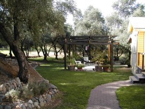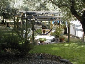 We have been using the old garage slab as a patio for quite a while now, with it's huge cracks, paint, tar, and glue spills, and patches of astroturf. Its ugly, but it is well positioned on the property: not too near any neighbor, nice view, and convenient to the door. But it was also hot hot hot -- too much direct sun, and the slab radiated heat long into the evening, making it uncomfortably warm even then.